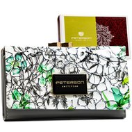 Duży portfel damski odszyty z wielokolorowej skóry naturalnej i ekologicznej, zamykany na zatrzask - Peterson
