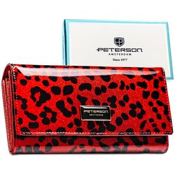 Czerwony, duzy portfel damski ze skóry ekologicznej i naturalnej w cętki, zamykany zatrzaskiem - Peterson