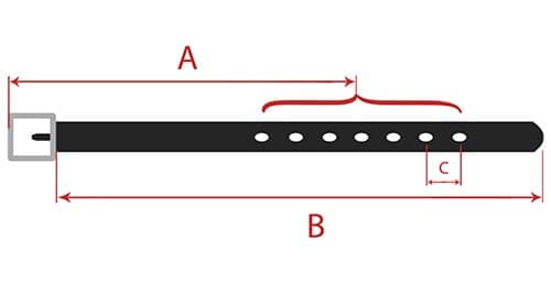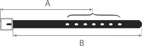 RozmiarPasuje na obwód w pasie (A)Długość bez klamry (B)Odległość między dziurkami (C)